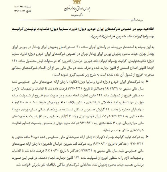 به گزارش ایبِنا، پس از تغییر شیوه توقف و بازگشایی نمادها در بورس نماد برخی شرکت ها مانند «آذرآب، کنتورسازی، های وب، بانک های صادرات، تجارت، پارسیان و پاسارگاد و ... » معلق و ۴ شرکت «گرانیت بهسرام، ایران خودرو دیزل، سایپا دیزل و قند شیرین» هم به علت شمولیت بیش از ۳ سال ماده ۱۴۱ قانون تجارت، مشمول لغو پذیرش شدند و قرار بود تا بهمن ماه تکلیف این ۴ شرکت مشخص شود.