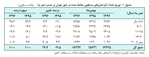 بررسی توزیع تعداد واحدهای مسکونی معامله شده در شهر تهران به تفکیک عمر بنا در بهمن ماه سال ۱۳۹۶ حاکی از آن است که از مجموع ۱۸۳۹۲ واحد مسکونی معامله شده، واحدهای تا ۵ سال ساخت با سهم ۴۸.۷ درصد بیشترین سهم را به خود اختصاص داده اند. سهم مذکور در مقایسه با بهمن ماه سال قبل ۵.۲ واحد درصد کاهش یافته و در مقابل به سهم واحدهای با قدمت بیش از ۱۵ سال افزوده شده است.