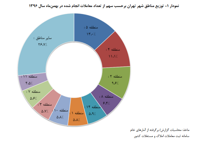 توزیع تعداد معاملات انجام شده بر حسب مناطق مختلف شهر تهران در بهمن ماه سال ۱۳۹۶ حاکی از آن است که از میان مناطق ۲۲ گانه شهر تهران، منطقه ۵ با سهم ۱۳.۰ درصدی از کل معاملات، بیشترین تعداد قراردادهای مبایعه نامه را به خود اختصاص داده است.