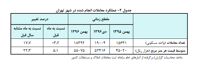 در بهمن ماه سال ۱۳۹۶ حجم معاملات واحدهای مسکونی و متوسط قیمت خرید و فروش یک متر مربع واحد مسکونی در شهر تهران به ترتیب به ۱۸.۴ هزار فقره و ۵۵.۱ میلیون ریال رسید که نسبت به ماه مشابه سال قبل به ترتیب ۱۷.۷ و ۲۲.۳ درصد افزایش نشان می دهد.