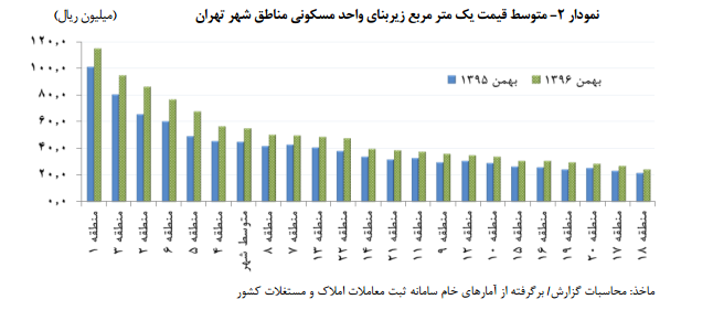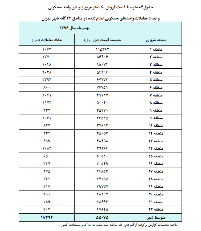 در بهمن ماه سال ۱۳۹۶، متوسط قیمت یک متر مربع زیربنای واحد مسکونی معامله شده از طریق بنگاه های معاملات ملکی شهر تهران ۵۵،۱ میلیون ریال بود که نسبت به ماه قبل و ماه مشابه سال قبل به ترتیب ۵.۱ و ۲۲.۳ درصد افزایش نشان می دهد. بیشترین رشد متوسط قیمت در این ماه نسبت به ماه مشاابه سال قبل به منطقه ۵ (معادل ۳۷.۸ درصد) و کمترین میزان رشد به منطقه ۲۰ (معادل ۱۲.۶ درصد) تعلق دارد.