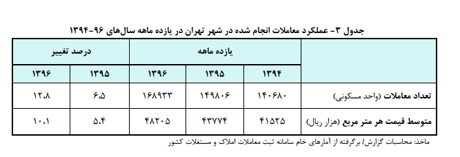 در یازده ماهه سال ۱۳۹۶، تعداد معاملات آپارتمان های مسکونی شهر تهران به ۱۶۸.۹ هزار واحد مسکونی رسیده که در مقایسه با مدت مشابه سال قبل، افزایش ۱۲.۸ درصدی را نشان می دهد. در این مدت متوسط قیمت یک متر مربع بنای واحد مسکونی معامله شده از طریق بنگاه های معاملات ملکی در شهر تهران ۴۸.۲ میلیون ریال بوده است که نسبت به مدت مشابه سال قبل ۱۰.۱ درصد افزایش نشان می دهد.