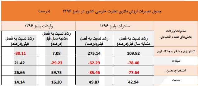 ارزش دلاری صادرات محصولاتاین بخش در فصل پاییز ۱۳۹۶ نسبت به فصل مشابه سال قبل از رشد مثبت ۱۰۹، ۸۲درصدیبرخوردار است. تغیرات آن نسبت به فصل گذشته فصل تابستان ۱۳۹۶، مثبت ۲۷۵، ۱۴ است.
