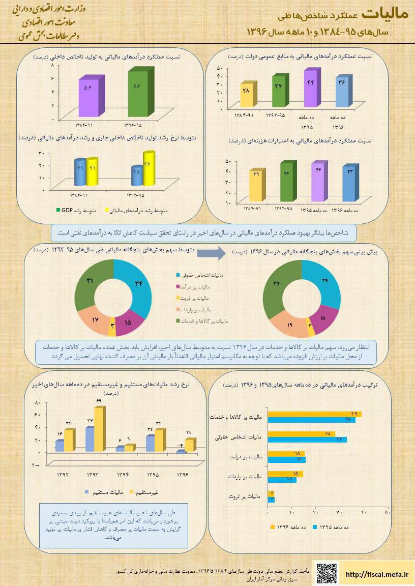 بر پایه این گزارش، بررسی نسبت عملکرد درآمدهای مالیاتی به تولید ناخالص داخلی در دوره زمانی ۸۴ تا ۹۱ به میزان ۵.۴ درصد و در دوره ۹۲ تا ۹۵ برابر با ۶.۶ درصد بوده است. در عین حال، متوسط نرخ رشد تولید ناخالص داخلی جاری و رشد درآمدهای مالیاتی در دوره زمانی ۸۴ تا ۹۱ به صورت ثابت ۲۱ درصد بود که این میزان در دوره سال های ۹۲ تا ۹۵ از ۱۵ درصد به ۲۷ درصد افزایش یافت.