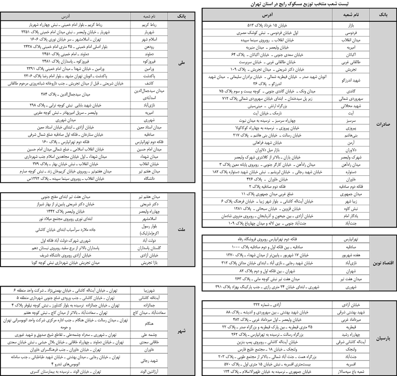 لیست شعب منتخب توزیع مسکوک رایج در استان تهران