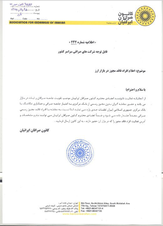 لذا نسبت به معامله با افراد فاقد مجوز رسمی صرافی مجدداً هشدار داده می شود و ضمناً اعضاء کانون صرافان ایرانیان می توانند نام و مشخصات و آدرس فعالیت افراد فاقد مجوز را که در بازار ارز حضور دارند ، به این کانون ارسال کنند.