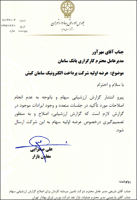 بر اساس این گزارش بورس تهران با صدور اطلاعیه ایی اعلام کرد: با توجه به بررسی های به عمل آمده توسط مدیریت پذیرش بورس اوراق بهادار تهران در خصوص ارزش گذاری قیمت سهام شرکت پرداخت الکترونیک سامان کیش «سپ» و عدم رفع ابهامات متذکر شده به شرکت کارگزاری بانک سامان به عنوان مدیر عرضه و همچنین عدم اصلاح گزارش ارزش گذاری سهام فوق الذکر، مکاتبه انجام شده با مدیر عرضه جهت اطلاع فعالین بازار ارائه می شود.
