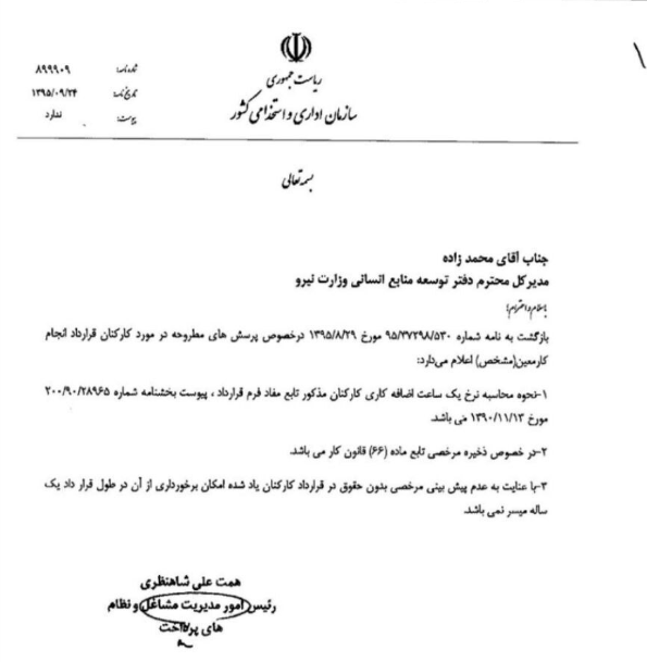 نحوه محاسبه یک ساعت اضافه کاری، ذخیره مرخصی و مرخصی بدون حقوق کارکنان قرارداد معین (مشخص) از سوی سازمان اداری استخدامی تعیین شد.