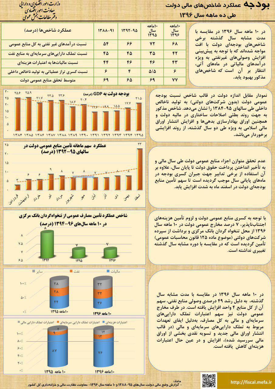 به گزارش ایبِنا، بررسی عملکرد شاخص های مالی دولت در ۱۰ ماهه نخست سال جاری نشان می دهد در دوره مورد بررسی نسبت به مدت مشابه سال قبل برخی شاخص های بودجه ای با افت مواجه شده اند که البته با وجود افزایش وصولی های غیرنفتی دولت به ویژه از محل درآمدهای مالیاتی، انتظار می رود این روند در دو ماه پایانی سال بهبود یافته باشد.