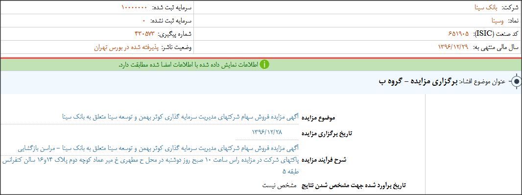 بر اساس این گزارش، «وسینا» در این اطلاعیه موضوع مزایده را آگهی فروش سهام شرکت های مدیریت سرمایه گذاری کوثر بهمن و توسعه سینا متعلق به بانک سینا اعلام کرد، که در روز ۲۸ اسفند ماه سال جاری برگزار خواهد شد.