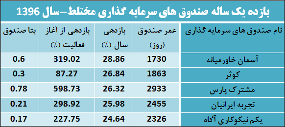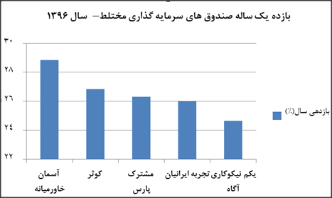 گزارش ایبِنا حاکی است، صندوق‌های برتر گروه صندوق‌های سرمایه‌گذاری مختلط که توانستند بالاترین بازدهی سال ۱۳۹۶ را در این گروه کسب کنند به ترتیب شامل صندوق‌های «آسمان خاورمیانه» سبدگردان آسمان، «کوثر» کارگزاری بانک صنعت و معدن، «مشترک پارس» کارگزاری آبان، «تجربه ایرانیان» کارگزاری بانک آینده و «یکم نیکوکاری آگاه» کارگزاری آگاه است.