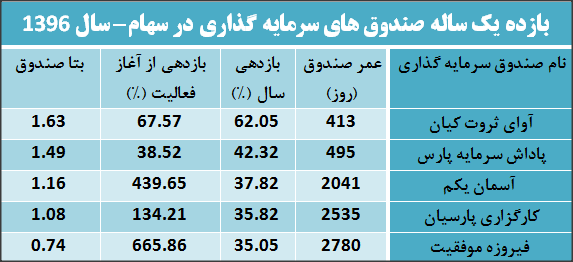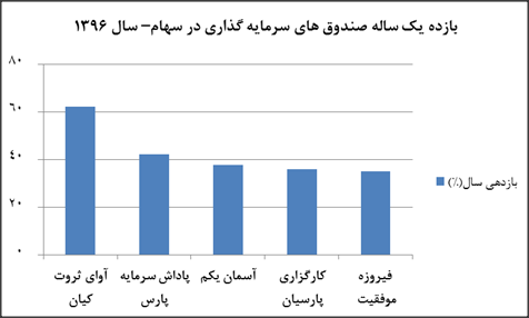 بررسی های ایبِنا نشان می دهد:‌ صندوق‌های سرمایه‌گذاری «آوای ثروت کیان» کارگزاری بورس آثل، «پاداش سرمایه پارس» سبدگردان پاداش سرمایه، «آسمان یکم» سبدگردان آسمان، «کارگزاری پارسیان» کارگزاری بانک پارسیان و «فیروزه موفقیت» کارگزاری فیروزه آسیا بیشترین بازدهی سال ۱۳۹۶ صندوق سرمایه‌گذاری در سهام کشور را کسب کردند.