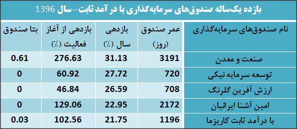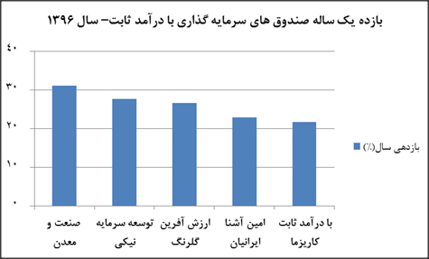 بر اساس گزارش ایبِنا، در بخش دیگری از این آمار مشخص شده است که در گروه صندوق‌های سرمایه‌گذاری با درآمد ثابت نیز به ترتیب صندوق‌های «صنعت و معدن» کارگزاری بانک صنعت و معدن، «توسعه سرمایه نیکی» مشاور سرمایه‌گذاری نیکی گستر، «ارزش آفرین گلرنگ» مشاور سرمایه‌گذاری آرمان آتی، «امین آشنای ایرانیان» کارگزاری سهم آشنا و «با درآمد ثابت کاریزما» سبدگردان کاریزما، بالاترین بازده یک ساله ۱۳۹۶ را کسب کرده‌اند.
