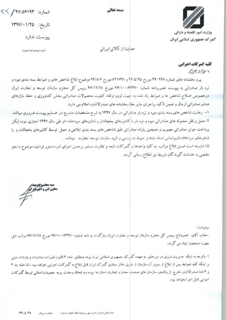 به گزارش ایبِنا، در بخشی از این بخشنامه آمده است: رعایت شاخص های بسته بندی میوه و تره بار صادراتی در سال ۱۳۹۷ به شرح مندرجات در ضمایم پیوست ضروری است.