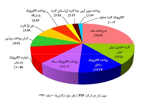 شرکت "به پرداخت ملت" با سهم ۲۱.۲۰ درصدی از تعداد و سهم ۲۵.۲۳ درصدی از مبلغ تراکنش ها در اسفند ۹۶ همچنان بیشترین سهم از بازار را به خود اختصاص داده و در جایگاه نخست هر دو سهم قرار گرفته است.