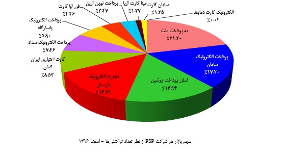 افزون بر این شرکت کارت اعتباری ایران کیش که با سهم ۸.۵۳ درصدی در مقام ۵ در تعداد تراکنش ها قرار گرفته و با سهم ۱۳.۵۰ درصدی از مبلغ تراکنش ها در رتبه دو این شاخص قرار دارد و این روند نشانگر این است که میانگین مبلغ تراکنش های این شرکت رقم های بزرگتری است. شرکت تجارت الکترونیک پارسیان نیز با سهم ۱۴.۲۹ درصدی از تعداد تراکنش ها در مقام ۴ قرار دارد و با سهم ۱۰.۷۸ درصدی از مبلغ تراکنش ها نیز در جایگاه ۵ قرار گرفته است.