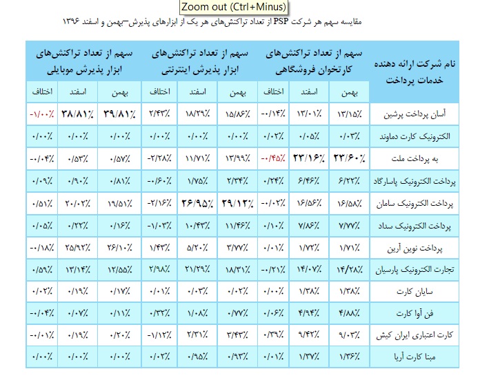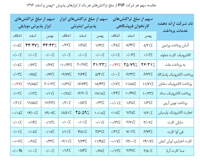 سهم هر یک از شرکتهای PSP از مبلغ تراکنشهای ابزارهای پذیرش در بهمن و اسفندماه ۹۶