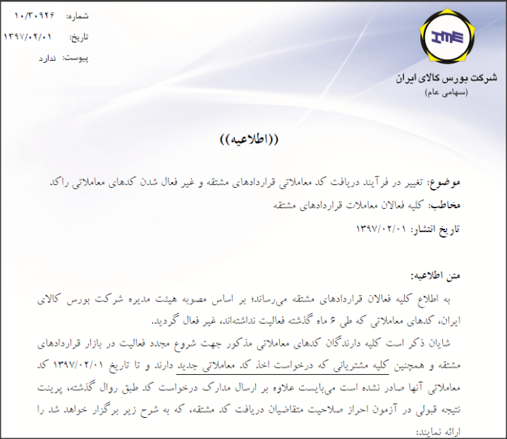 متن اطلاعیه حذف کدهای معاملاتی غیرفعال در بورس کالا