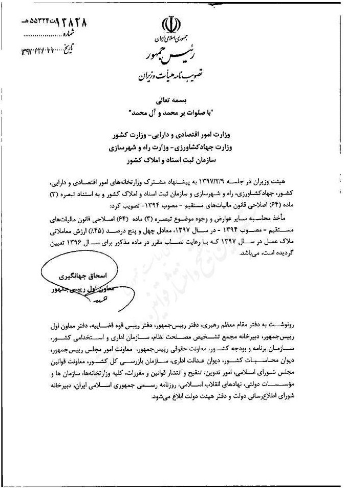 به گزارش ایبِنا در مصوبه دولت آمده است: هیات وزیران در جلسه ۱۳۹۷.۰۲.۰۹ به پیشنهاد مشترک وزارتخانه امور اقتصادی و دارایی، کشور، جهاد کشاورزی، راه و شهرسازی و سازمان ثبت اسنادی و املاک کشور و استناد تبصره ۲ ماده ۶۴ اصلاحی قانون مالیات های مستقیم مصوب ۱۳۹۴ تصویب کرد: ماخذ محاسبه سایر عوارض و وجوه موضوع تبصره ۲ ماده ۶۴ اصلاحی قانون مالیات های مستقیم مصوب ۱۳۹۴ در سال ۱۳۹۷ معادل چهل و پنج درصد (۴۵٪) ارزش معاملاتی ملاک عمل در سال ۱۳۹۷ که با رعایت نصاب مقرر در ماده مذکور برای سال ۱۳۹۶ تعیین شده، است.
