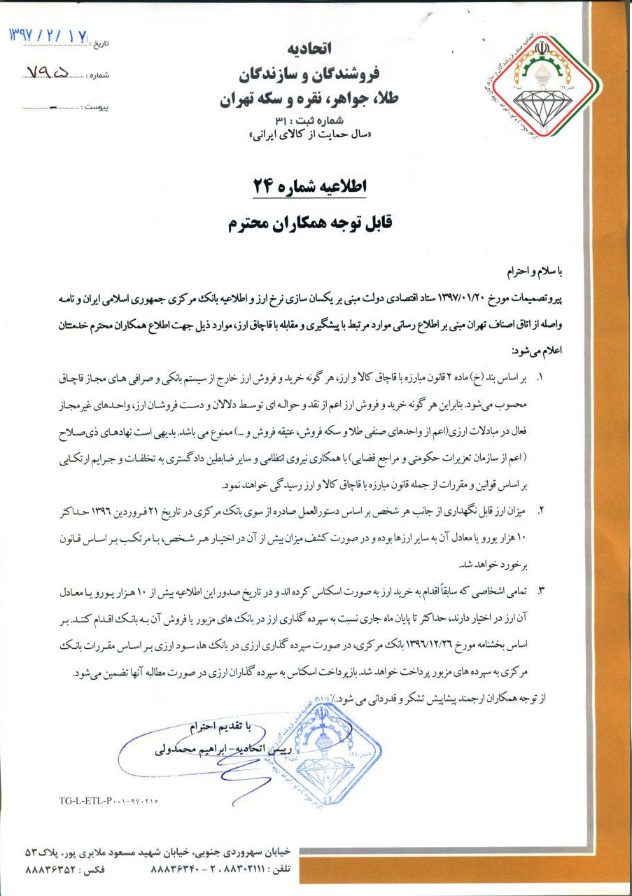 به گزارش ایبِنا، اتحادیه فروشندگان و سازندگان طلا، جواهر، نقره و سکه تهران در اطلاعیهای اعلام کرد: پیرو تصمیمات مورخ ۱۳۹۱.۰۱.۲۰ ستاد اقتصادی دولت مبنی بر یکسان سازی نرخ ارز و اطلاعیه بانک مرکزی جمهوری اسلامی ایران و نامه واصله از اتاق اصناف تهران مبنی بر اطلاعرسانی موارد مرتبط با پیشگیری و مقابله با قاچاق ارز، موارد ذیل جهت اطلاع همکاران محترم اعلام میشود: