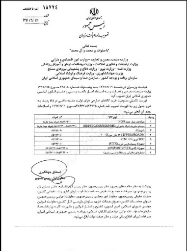 به گزارش خبرنگار ایبِنا، در مصوبه هیات وزیران که به وزارتخانه های صمت، اقتصاد، ارتباطات، بهداشت، نفت، نیرو، دفاع، کشاورزی، ارشاد و سازمان برنامه و صداوسیما ابلاغ شده آمده است: خرید کالاهایی از جمله سیستم مدیریت شبکه مخابراتی، ‌ شبکه های نسل جدید، برخی تجهیزات مخابراتی، تجهیزات اکتیو و ... به شرط وجود تولید مشابه داخل، از خارج از کشور ممنوع است.