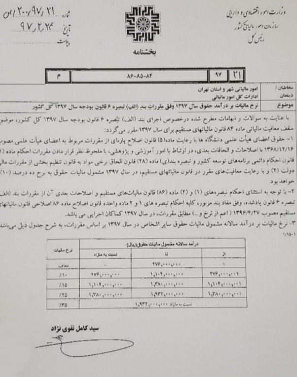 بر اساس این بخشنامه، به این ترتیب حقوق اعضای هیات علمی دانشگاه با رعایت ماده ۵ قانون اصلاح پارهای از مقررات مربوط به اعضای هیات علمی با اصلاحات و الحاقات بعدی، مشمول مالیات حقوق با نرخ ۱۰ درصد خواهد بود.