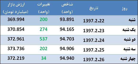 نگاهی دقیق تر به فرایند رفتار معاملاتی سهامداران حقیقی و حقوقی در تالار شیشه ای مشخص می کند که در پایان معاملات هفته منتهی به ۲۶ اردیبهشت ماه ۹۷ شاخص کل بورس با ۱.۳ درصد افزایش نسبت به هفته سوم اردیبهشت ماه، به رقم ۹۴.۹۴۰ واحد رسیده است.