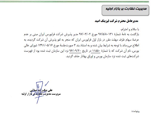 مدیریت نظارت بر بازار اولیه سازمان بورس و اوراق بهادار با صدور یک نامه رسمی اعلام کرد که شرکت لیزینگ امید از میان شرکت های بورسی حذف شد.
