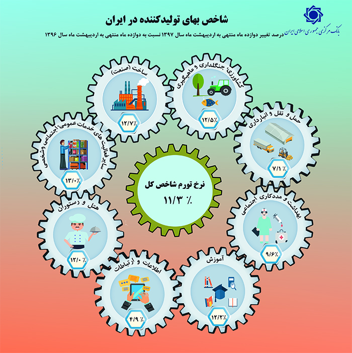 شاخص بهای تولیدکننده در ایران در دوازده ماه منتهی به اردیبهشت ماه ۱۳۹۷ نسبت به دوازده ماه منتهی به اردیبهشت ماه ۱۳۹۶ به‌میزان ۱۱.۳ درصد افزایش یافته است.