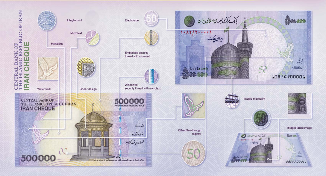 ویژگی‌های امنیتی ایران چک ۵۰۰۰۰۰ ریالی طرح بارگاه امام رضا (ع) - مشهد