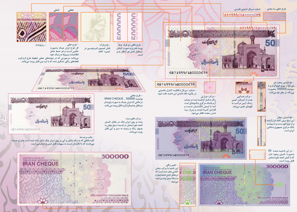 ویژگی‌های امنیتی ایران چک ۵۰۰۰۰۰ریالی طرح قدیم