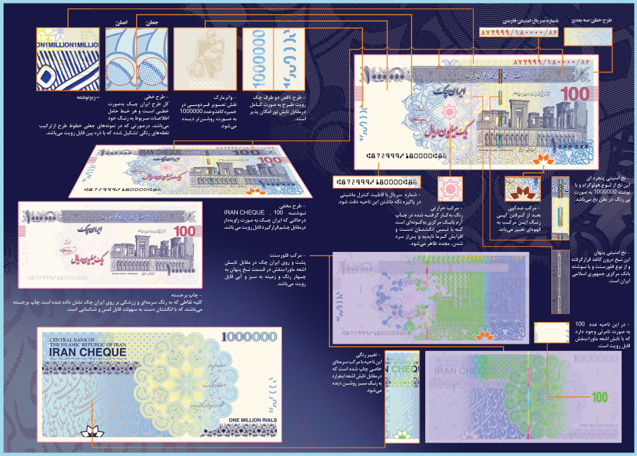 ۱۱ -طرح مخفی : نوشته ۱۰۰، IRAN‌ ‌CHEQUE درحالتی که ایران‌چک به صورت زاویه‌دار در مقابل چشم قرار بگیرد، قابل رویت می‌باشد.