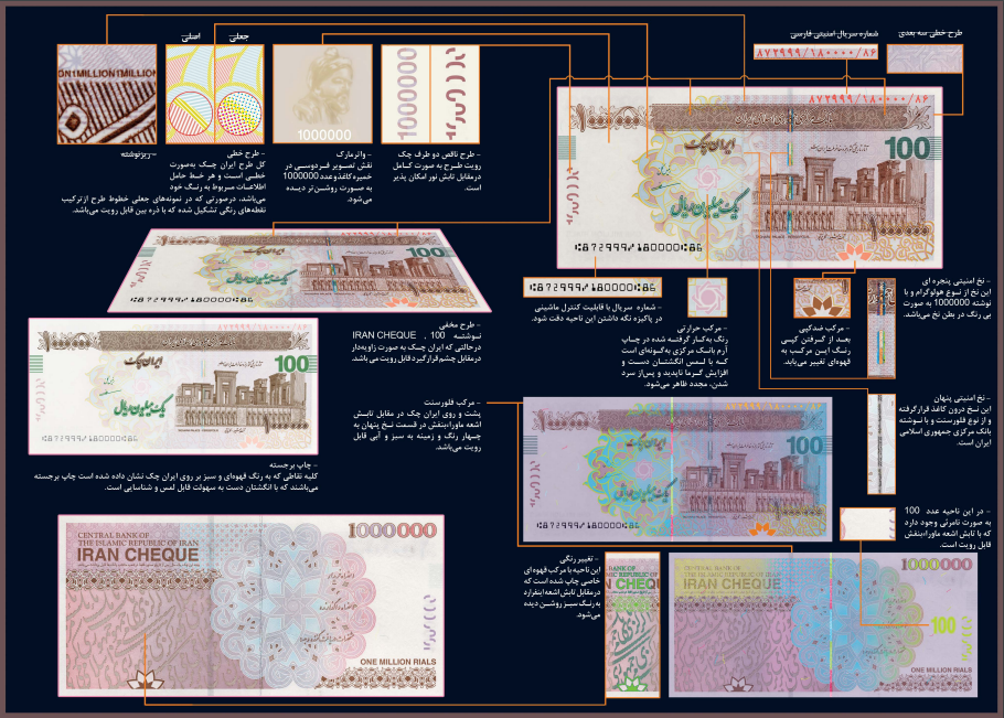 ویژگی‌های امنیتی ایران چک ۱۰۰۰.۰۰۰  (قهوه‌ای رنگ)