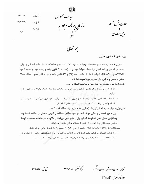 - وزارت امور اقتصادی و دارایی موظف است از طریق سازمان امور مالیاتی و خزانه داری کل کشور نسبت به وصول اقساط وام های دریافتی شرکت ها و موسسات تا تسویه کامل اقدام نمایند.