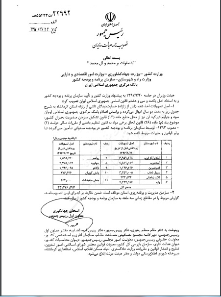 به گزارش خبرنگار ایبِنا، در بخشی از این ابلاغیه خطاب به وزارتخانه های کشور، جهاد کشاورزی، امور اقتصادی و دارایی، راه و شهرسازی، سازمان برنامه و بودجه و بانک مرکزی آمده است: اصل تسهیلات اخذ شده (قبل از زلزله) خسارت دیدگان ناشی از زلزله استان کرمانشاه به مدت دوسال در شهرهای اسلام آباد غرب، گیلانغرب، قصرشیرین،‌ سرپل ذهاب، ثلاث باباجانی و پاوه امهال می شود.