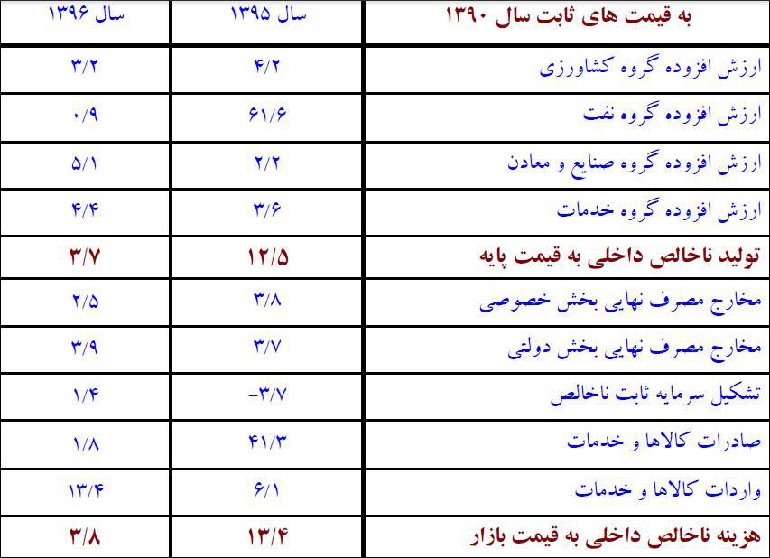 بر اساس محاسبات اولیه و مقدماتی، تولید ناخالص داخلی کشور در سال ۱۳۹۶(به قیمت های ثابت سال ۱۳۹۰) به ۸/۶۹۴۰ هزار میلیارد ریال رسیده است که در مقایسه با رقم دوره مشابه سال قبل (۱/۶۶۹۱ هزار میلیارد ریال)، معادل ۷/۳ درصد افزایش یافته است. لازم به ذکر است که رشد تولید ناخالص داخلی در سه ماهه چهارم سال ۱۳۹۶ نسبت به دوره مشابه سال قبل، معادل ۷/۲ درصد است.