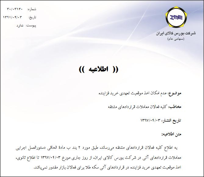 به گزارش ایبِنا، مدیریت توسعه بازار مشتقه بورس کالا در اطلاعیهای اعلام کرده که "طبق مورد ۲ بند «ب» ماده الحاقی دستورالعمل اجرایی معاملات قراردادهای آتی در شرکت بورس کالا از روز جاری تا اطلاع ثانوی اخذ موقعیت تعهدی خرید فزاینده در قراردادهای آتی سکه طلا برای فعالان بازار مقدور نیست. "