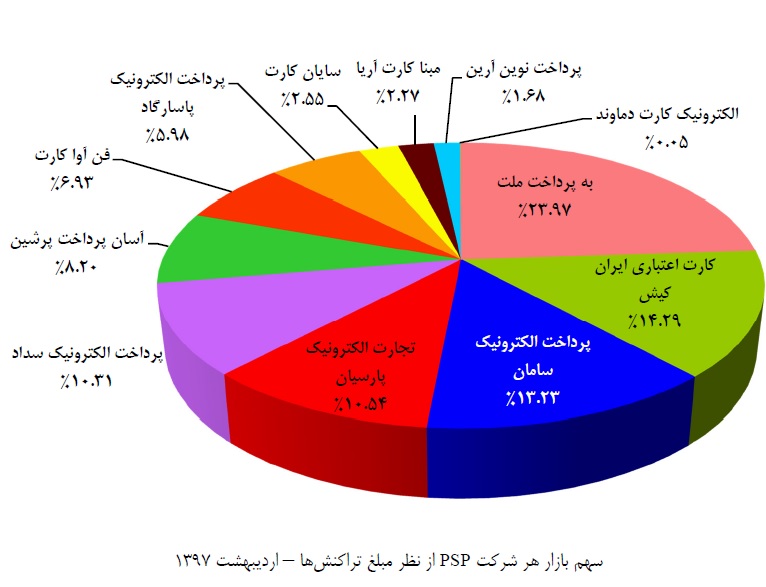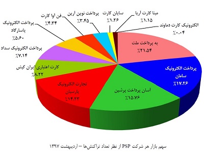 در اردیبهشتماه ۹۷ سهم تعدادی بین دو شرکت "سایان کارت" و" مبنا کارت آریا"جابهجایی صورت گرفته و مبنا کارت آریا با از رتبه ۱۰ با روند نزولی به جایگاه ۱۱ رسیده و جای خود را به سایان کارت سپرده است. همچنین در شاخص سهم مبلغی نیز شرکت پرداخت الکترونیک ستاد با سهم ۱۰.۶۰ درصدی در فروردین و جایگاه چهارم با کاهش ۰.۲۹ درصدی و یک رتبه نزول و سهم ۱۰.۳۱ به جایگاه پنجم در اردیبهشتماه ۹۷ رسیده و جایگاه خود را به پرداخت الکترونیک پارسیان با سهم ۱۰.۵۴ درصدی داده است. همچنین افزایش ۱.۳۳ درصدی سهم مبلغی شرکت ایران کیش و در مقابل کاهش بالغبر دودرصدی به پرداخت نیز اشاره کرد.