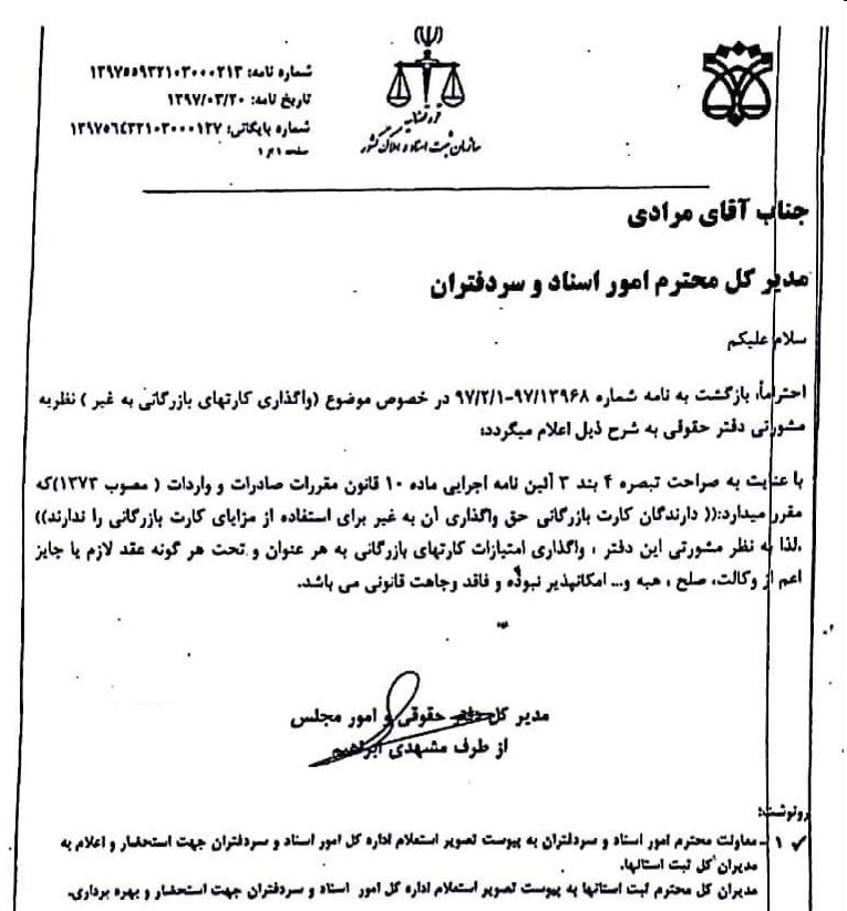 به گزارش ایبِنا، رضا مشهدی ابراهیم مدیر کل دفتر حقوقی و امور مجلس سازمان ثبت اسناد و املاک کشور در مورد واگذاری کارتهای بازرگانی به غیر به مدیرکل امور اسناد و سردفتران نامه نوشت.