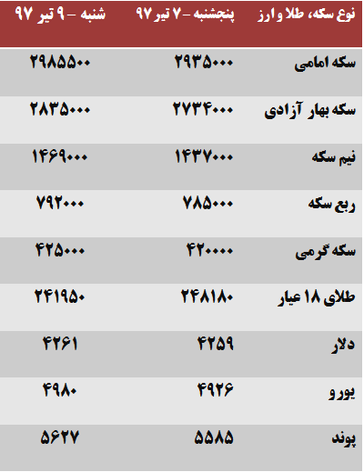 از سویی دیگر، امروز در بازار آزاد هر قطعه نیم سکه بهار آزادی با ۳۲ هزار تومان افزایش نسبت به پنج شنبه گذشته یک میلیون و ۴۶۹ هزار تومان و هر قطعه ربع بهار آزادی نیز با ۷ هزار تومان افزایش به ارزش ۷۹۲ هزار تومان معامله شد. بر اساس این گزارش، هر قطعه سکه گرمی با ۵ هزار تومان رشد ۴۲۰ هزار تومان معامله شد و هر گرم طلای ۱۸ عیار نیز با کاهش قیمت ۶ هزار و ۲۳۰ تومانی به ارزش ۲۴۱ هزار و ۹۵۰ تومان رسید.