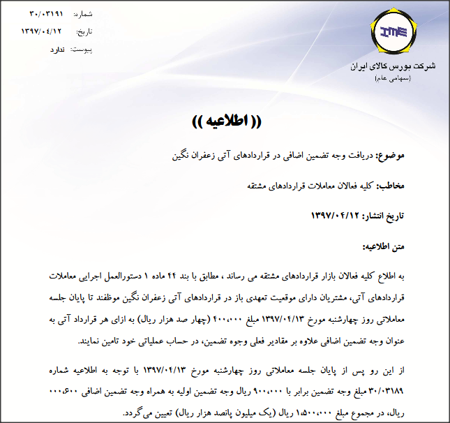 به گزارش ایبِنا، بر اساس بند ۴۴ ماده یک دستورالعمل اجرایی معاملات قراردادهای آتی، مشتریان دارای موقعیت تعهدی باز در قراردادهای آتی زعفران نگین موظف هستند، تا پایان جلسه معاملاتی روز چهارشنبه ۱۳ تیر ماه ۱۳۹۷ مبلغ ۴۰ هزار تومان به ازای هر قرارداد آتی را به عنوان وجه تضمین اضافی علاوه بر مقادیر فعلی وجوه تضمین در حساب عملیاتی خود تأمین نمایند.