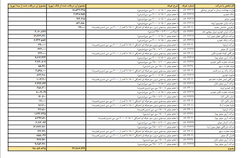 گفتنی است، در ستاد اقتصادی دولت مقرر شده بانک مرکزی با هماهنگی دستگاه های ذیربط و مسئول، نسبت به انتشار فهرست دریافت کنندگان ارز رسمی اقدام کند. بر این اساس در ادامه انتشار نخستین فهرست شرکتهای دریافت کننده ارز توسط بانک مرکزی در روز یکشنبه دهم تیرماه، فهرست زیر که حاوی میزان تامین ارز رسمی برای واردات خودرو بوده و از سوی وزارت صنعت، معدن و تجارت در اختیار قرار گرفته، منتشر میشود.
