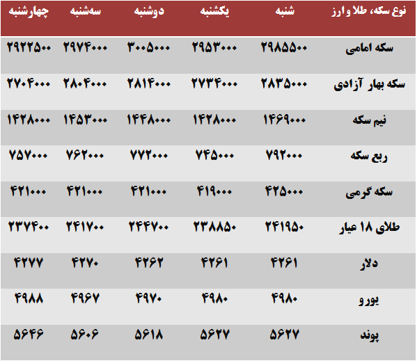 از سویی دیگر، امروز در بازار آزاد هر قطعه نیم سکه بهار آزادی با ۲۵ هزار تومان کاهش نسبت به روز گذشته یک میلیون و ۴۲۸ هزار تومان و هر قطعه ربع بهار آزادی نیز با ۵ هزار تومان افت به ارزش ۷۵۷ هزار تومان معامله شد. بر اساس این گزارش، هر قطعه سکه گرمی بدون تغییر قیمت ۴۲۱ هزار تومان معامله شد و قیمت هر گرم طلای ۱۸ عیار نیز با کاهش ۴ هزار و ۳۰۰ تومانی به ارزش ۲۳۷ هزار و ۴۰۰ تومان رسید.