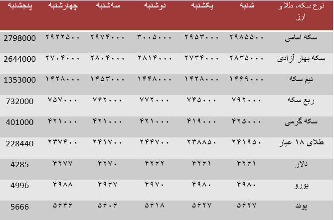 از سویی دیگر، امروز در بازار آزاد هر قطعه نیم سکه بهار آزادی با ۷۵ هزار تومان کاهش نسبت به روز گذشته یک میلیون و ۳۵۳ هزار تومان و هر قطعه ربع بهار آزادی نیز با ۲۵ هزار تومان افت به ارزش ۷۳۲ هزار تومان معامله شد. بر اساس این گزارش، هر قطعه سکه گرمی با ۲۰ هزار تومان کاهش ۴۰۱ هزار تومان معامله شد و قیمت هر گرم طلای ۱۸ عیار نیز با کاهش ۸ هزار و ۹۶۰ تومانی به ارزش ۲۲۸ هزار و ۴۴۰ تومان رسید.