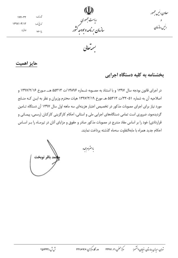 در این بخشنامه آمده است، در اجرای قانون بودجه سال ۹۷ و با استناد به مصوبه شماره ۱۴۸۹۶/ت۵۵۳۱۳هـ مورخ ۱۶ اردیبهشت ۹۷ و اصلاحیه آن به شماره ۳۲۰۵۱/ت۵۵۳۱۳هـ مورخ ۱۳ خرداد ۹۷ هیأت وزیران و نظر به اینکه منابع موردنیاز برای اجرای مصوبات یادشده در تخصیص اعتبار هزینهای سهماهه اول سال ۹۷ آن دستگاه تأمین شده بود، ضروری است، تمام دستگاههای اجرایی ملی و استانی، احکام کارگزینی کارکنان رسمی، پیمانی و قراردادی خود را بر اساس مفاد مندرج در مصوبات مذکور صادر و حقوق و مزایای آنان در تیرماه را بر اساس احکام جدید همراه با مابهالتفاوت سه ماه گذشته پرداخت کنند.