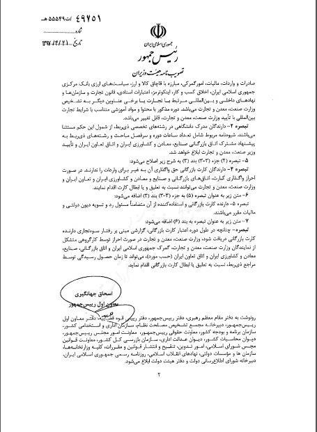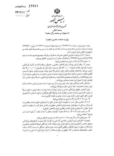 به گزارش ایبِنا، در بخشی از ابلاغیه ای از اسحاق جهانگیری به وزارت صنعت، معدن و تجارت آمده است: سقف ارزشی واردات برای اشخاص حقیقی و حقوقی دریافت کننده کارت بازرگانی، برای سال اول، ۵۰۰ هزار دلار و برای سال دوم ۲ میلیون دلار تعیین می شود.
