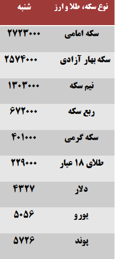 از سویی دیگر، امروز در بازار آزاد هر قطعه نیم سکه بهار آزادی با ۱۰ هزار تومان افت نسبت به پنج شنبه گذشته یک میلیون و ۳۰۳ هزار تومان و هر قطعه ربع بهار آزادی نیز بدون تغییر به ارزش ۶۷۲ هزار تومان معامله شد. بر اساس این گزارش، هر قطعه سکه گرمی با ۵ هزار تومان رشد قیمت ۴۰۱ هزار تومان معامله شد و قیمت هر گرم طلای ۱۸ عیار نیز با رشد یک هزار و ۲۷۰ تومانی به ارزش ۲۲۹ هزار تومان فروخته شد.
