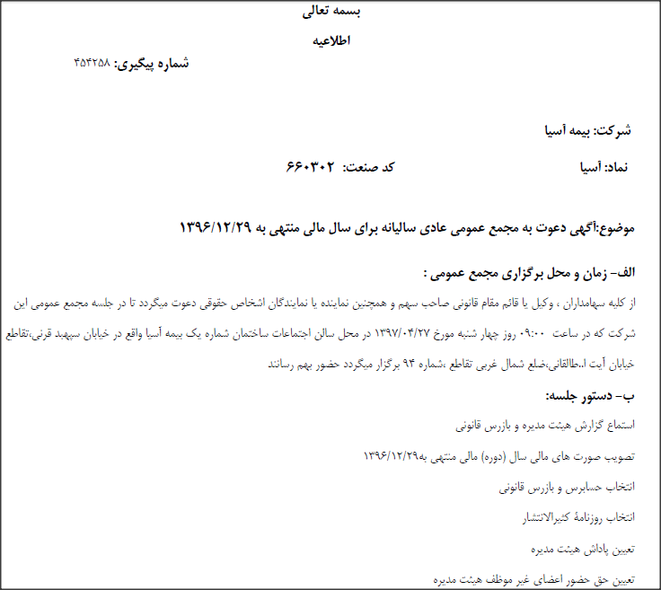 متن اطلاعیه دعوت به مجمع بیمه آسیا