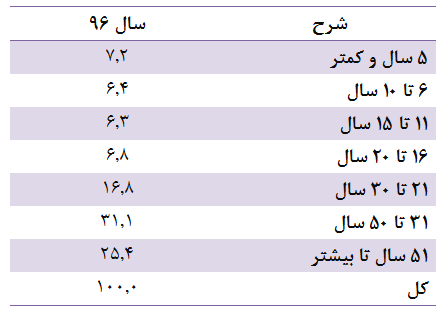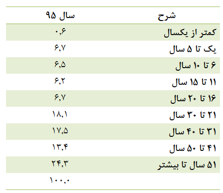 براساس این تقسیم بندی، در سال ۹۵، افراد کمتر از یک سال ۰.۶ درصد، یک تا ۵ سال ۶.۷ درصد، ۶ تا ۱۰ سال ۶.۵ درصد و ۱۱ تا ۱۵ سال ۶.۲ درصد، ۱۶ تا ۲۰ سال ۶.۷ درصد و ۲۱ تا ۳۰ سال ۱۸.۱ درصد از کل جمعیت را به خود اختصاص داده اند. اما تفاوتی که در رده بندی سال ۹۵ با سال گذشته وجود دارد این است که افراد ۳۱ تا ۵۰ ساله در این سال به دو گروه ۳۱ تا ۴۰ سال با ۱۷.۵ درصد و ۴۱ تا ۵۰ سال با ۱۳.۴ درصد تقسیم بندی شده اند، در حالی که در سال ۹۶ در مجموع این دو گروه سهم ۳۱.۱ درصد از کل جامعه را به خود اختصاص داده بودند.