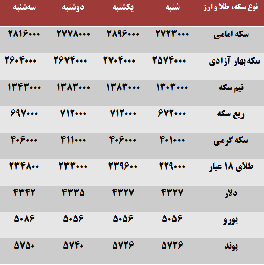 بر اساس این گزارش، هر قطعه سکه گرمی با ۵ هزار تومان اُفت به قیمت ۴۰۶ هزار تومان معامله شد و قیمت هر گرم طلای ۱۸ عیار نیز با رشد یک هزار و ۸۰۰ تومانی به ارزش ۲۳۴ هزار و ۸۰۰ تومان فروخته شد.